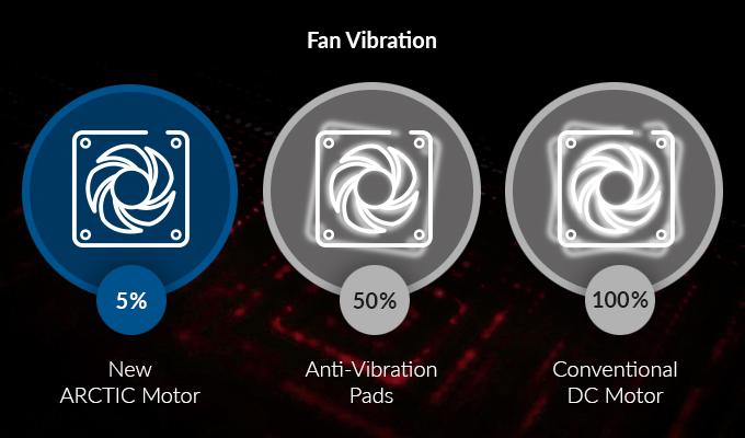 Even at low speeds, the operating sound of the new ARCTIC motor is barely noticeable. Due to sinus-magnetizing the new motor only creates about 5 % of the vibration from the commutation of a regular DC motor without a filter. Consequently, there is no need for rubber spacers due to the steady and smooth torque of the new motor.
