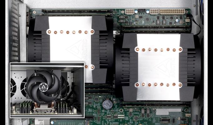 The installed PWM fans benefit from all the advantages of the award-winning P series. Designed for static pressure, the fans are ideal for the Freezer 4U-M Rev. 2's high fin density and provide efficient heat dissipation in push-pull mode, even in power-hungry applications. Especially office workstations benefit from the quiet fans. The dual configuration also allows for inherent redundancy and protects the system from total shutdown caused by heat.