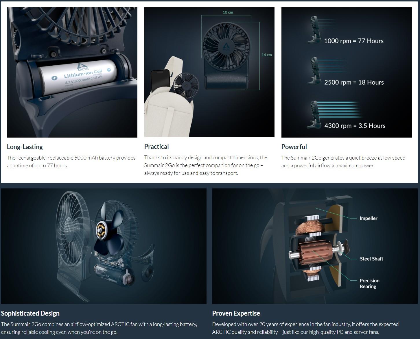 ARCTIC Summair 2Go este un ventilator portabil puternic, compact si extrem de practic, creat pentru a oferi o racorire eficienta oriunde te-ai afla. Cu o baterie de 5000 mAh ce poate functiona pana la 77 de ore, control al fluxului de aer fara trepte si un design ergonomic cu suport integrat, este companionul ideal pentru calatorii, birou sau activitati in aer liber.