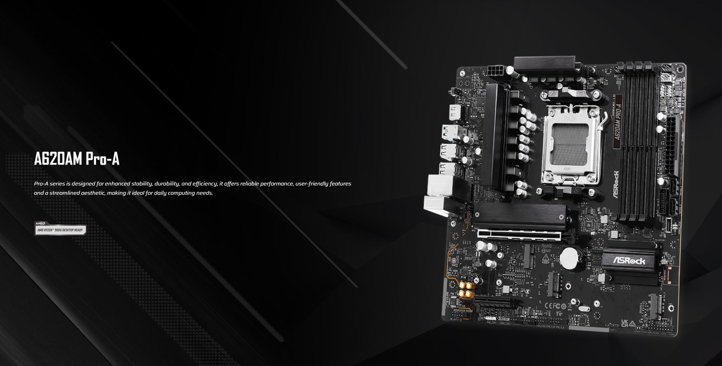 ASRock A620AM Pro-A este o placa de baza moderna si fiabila, proiectata pentru sisteme echilibrate cu procesoare AMD Ryzen, oferind suport pentru tehnologii actuale, conectivitate variata si o constructie solida potrivita pentru PC-uri de birou sau utilizare zilnica.
