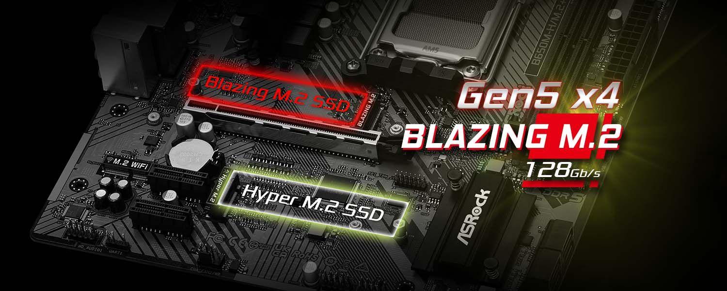 | Storage | CPU: - 1 x Blazing M.2 Socket (M2_1, Key M), supports type 2280 PCIe Gen5x4 (128 Gb/s) mode* - 1 x Hyper M.2 Socket (M2_2, Key M), supports type 2260/2280 PCIe Gen4x4 (64 Gb/s) mode* Chipset: - 4 x SATA3 6.0 Gb/s Connectors * Supports NVMe SSD as boot disks