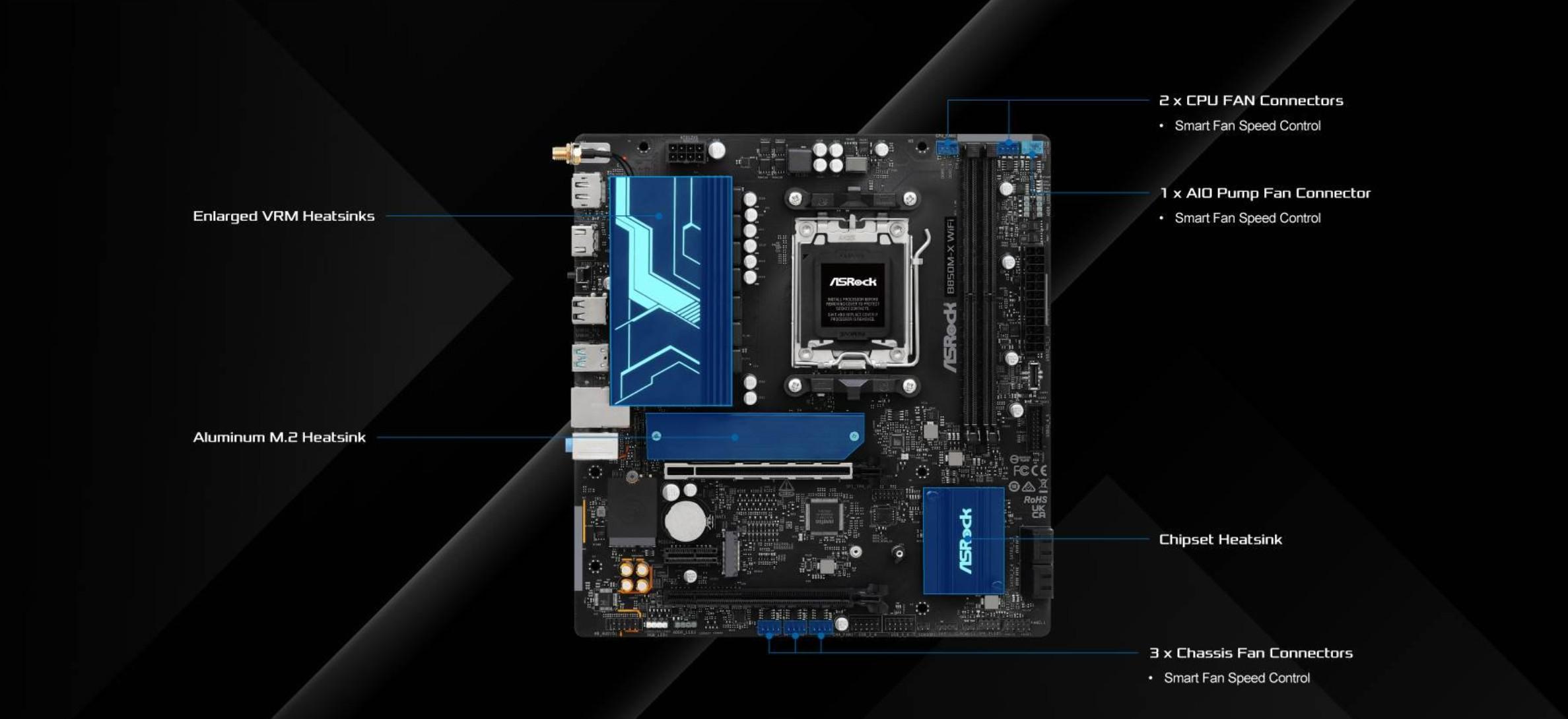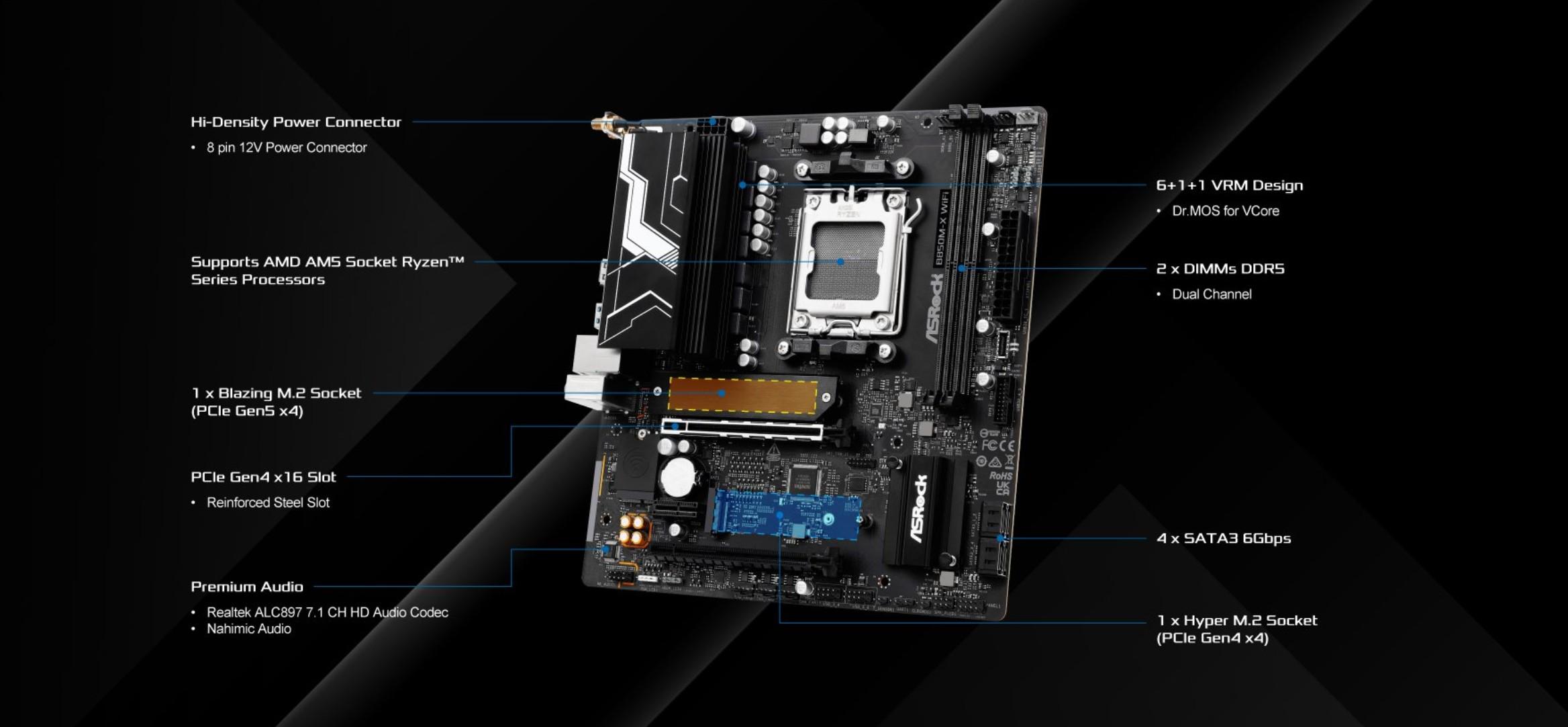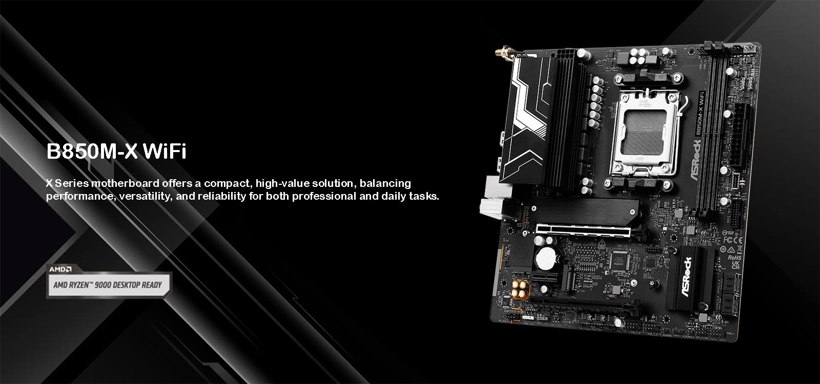 | CPU | - Supports AMD Socket AM5 Ryzen 9000, 8000 and 7000 Series Processors* *The availability of expansion slots may vary by CPU. Please refer to PCIe/M.2 Bandwidth Table for details.