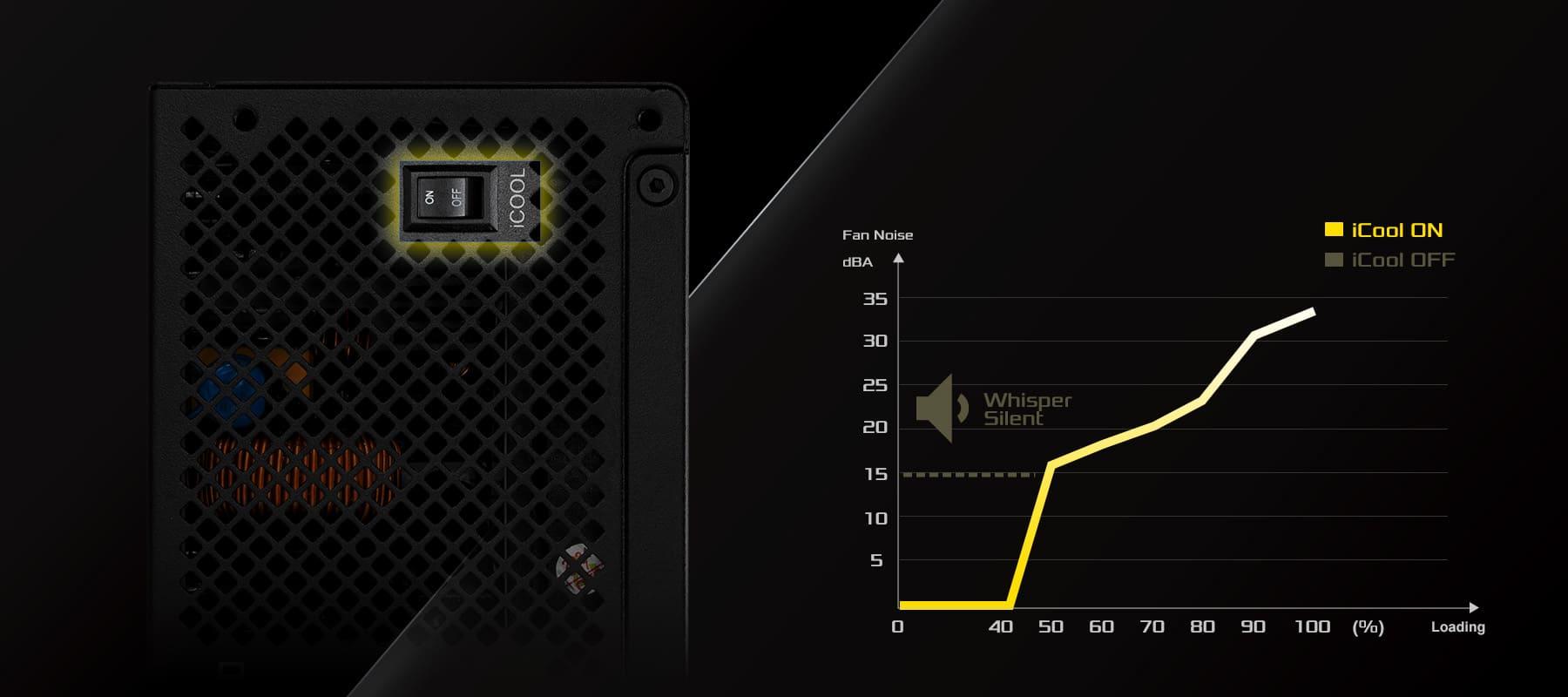 ●iCOOL Mode ON: The power supply runs more efficiently. The fan stays off during low to medium loads, reducing noise and improving energy efficiency. The fan only activates when the load or temperature increases.