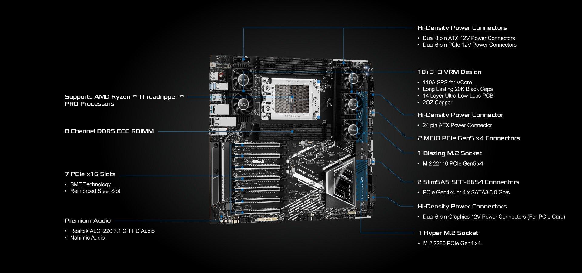 | CPU | - Supports AMD Ryzen Threadripper PRO 9000/7000 WX-Series Processors - Supports AMD Socket sTR5 - Supports ASRock Hyper BCLK Engine |