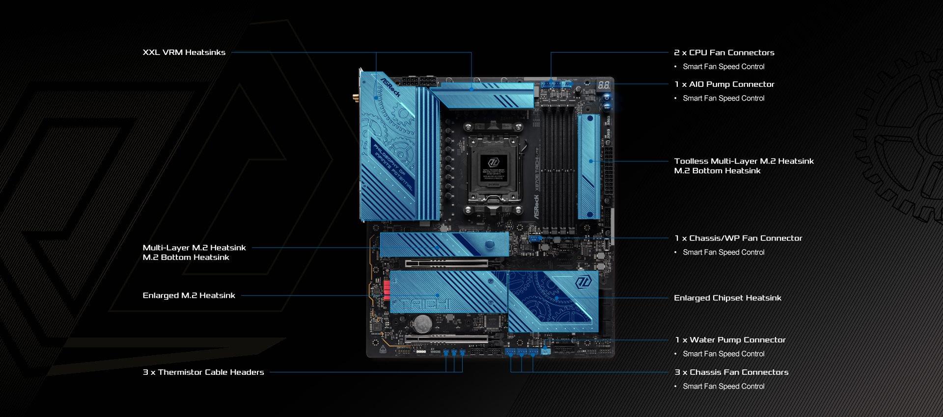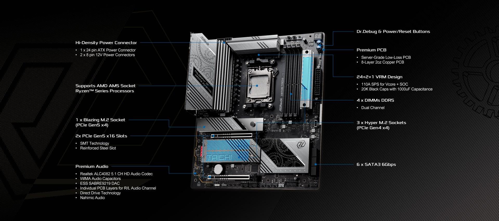 | Unique Feature | Superb Productivity - PCIe Gen5 (Graphics, M.2) - Dual Channel DDR5 - USB4 Type-C Ports (40 Gb/s) Rock-Solid Durability - Server-Grade Low-Loss PCB - 24+2+1 Power Phase, 110A SPS for VCore+SOC with Enlarged Heatsink Armor - Flexible Integrated I/O Shield - 20K Long-lasting Black Caps (high quality and conductive polymer capacitors) Ultrafast Connectivity - 5G LAN, 802.11be Wi-Fi 7 Module - ASRock Lightning Gaming Ports EZ Update - BIOS Flashback Button - ASRock Auto Driver Installer |