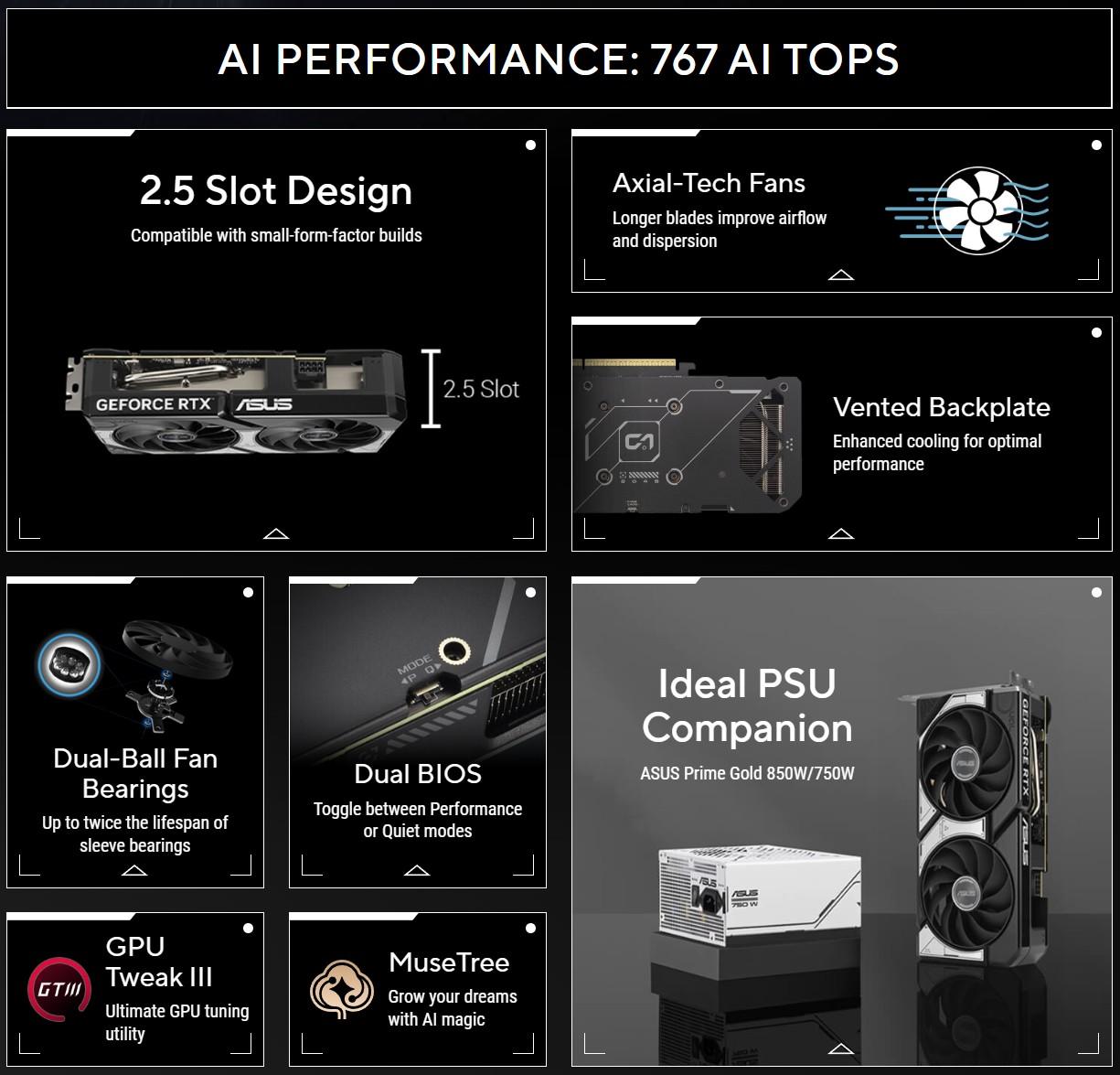 ASUS Dual GeForce RTX 5060 Ti combines powerful thermal performance with broad compatibility. Advanced cooling solutions from flagship graphics cards — including two Axial-tech fans for optimizing airflow to the heatsink. Designed in a compact 2.5-slot form factor, delivering more power in less space. These enhancements make ASUS Dual the perfect choice for gamers who want heavyweight graphics performance in a compact build.
