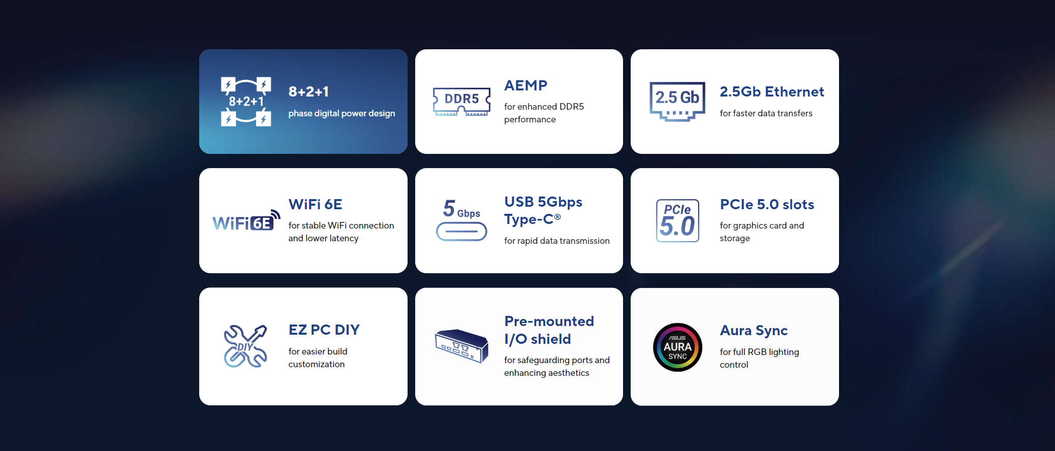 | Ethernet | 1 x Realtek 2.5Gb Ethernet ASUS LANGuard |