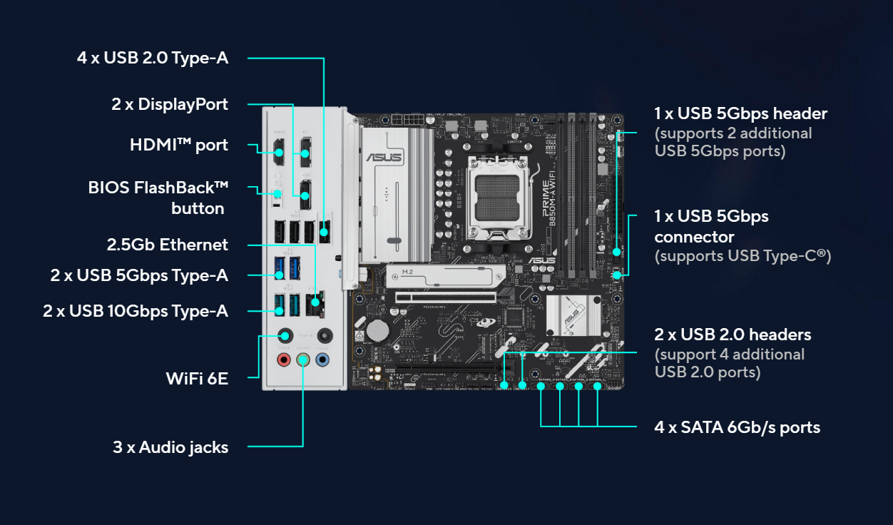| Expansion Slots | AMD Ryzen 9000 & 7000 Series Desktop Processors* 1 x PCIe 5.0 x16 slot (supports x16 mode) AMD Ryzen 8000 Series Desktop Processors 1 x PCIe 4.0 x16 slot (supports x8/x4 mode)** AMD B850 Chipset 1 x PCIe 4.0 x16 slot (supports x1 mode) * Please check the PCIe bifurcation table on the support site (https://www.asus.com/support/FAQ/1037507/). ** Specifications vary by CPU types. - To ensure compatibility of the device installed, please refer to https://www.asus.com/support/download-center/ for the list of supported |