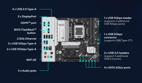 | Back Panel I/O Ports | 2 x USB 10Gbps ports (2 x Type-A) 2 x USB 5Gbps ports (2 x Type-A) 4 x USB 2.0 ports (4 x Type-A) 2 x DisplayPort 1 x HDMI port 1 x Wi-Fi module 1 x Realtek 2.5Gb Ethernet port 3 x Audio jacks 1 x BIOS FlashBack button |