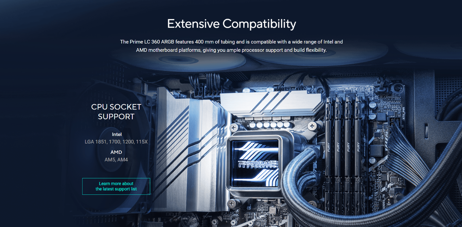 Racitor CPU all-in-one cu lichid "Prime LC ARGB" cu zone de contact cu CPU special concepute si canale cu aripioare, bloc de apa cu o lentila Infinity Mirror, ventilatoare ARGB preinstalate si iluminare "Aura".