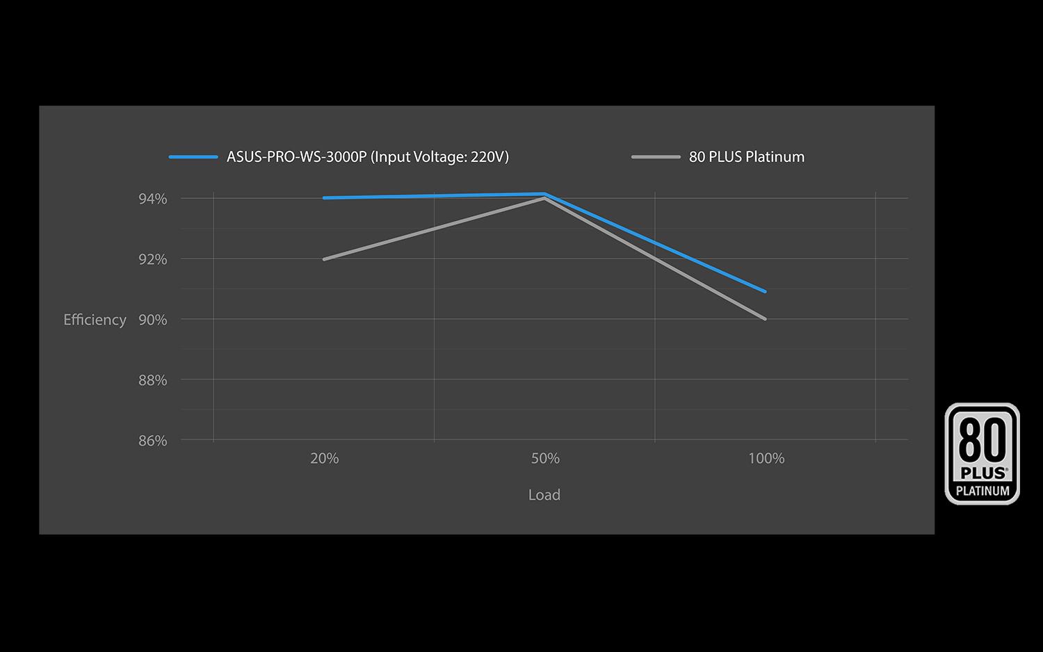 The ASUS Pro WS Platinum uses low-ESR Japanese server-grade capacitors to ensure efficient operation. This upgrade enables an 80 PLUS Platinum certification, which guarantees 89% efficiency at 100% load and 92% efficiency at 50% load. This increased efficiency results in less heat, reduced fan noise and increased reliability.
