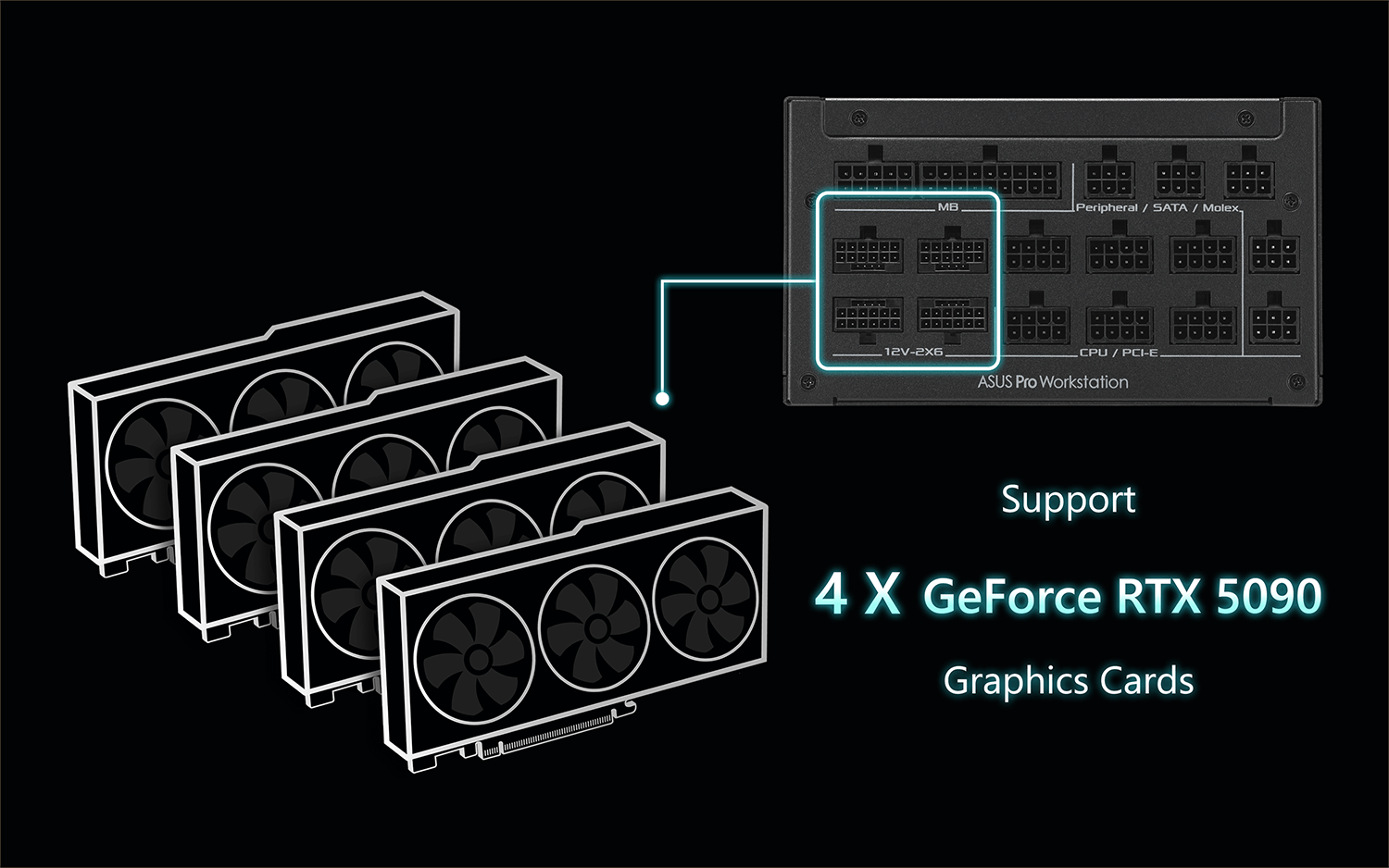 Designed to reliably deliver the thousands of watts necessary to power up to four NVIDIA GeForce RTX 5090 graphics cards, the ASUS Pro WS 3000W Platinum enables breakthrough performance that meets the needs of demanding AI workloads.