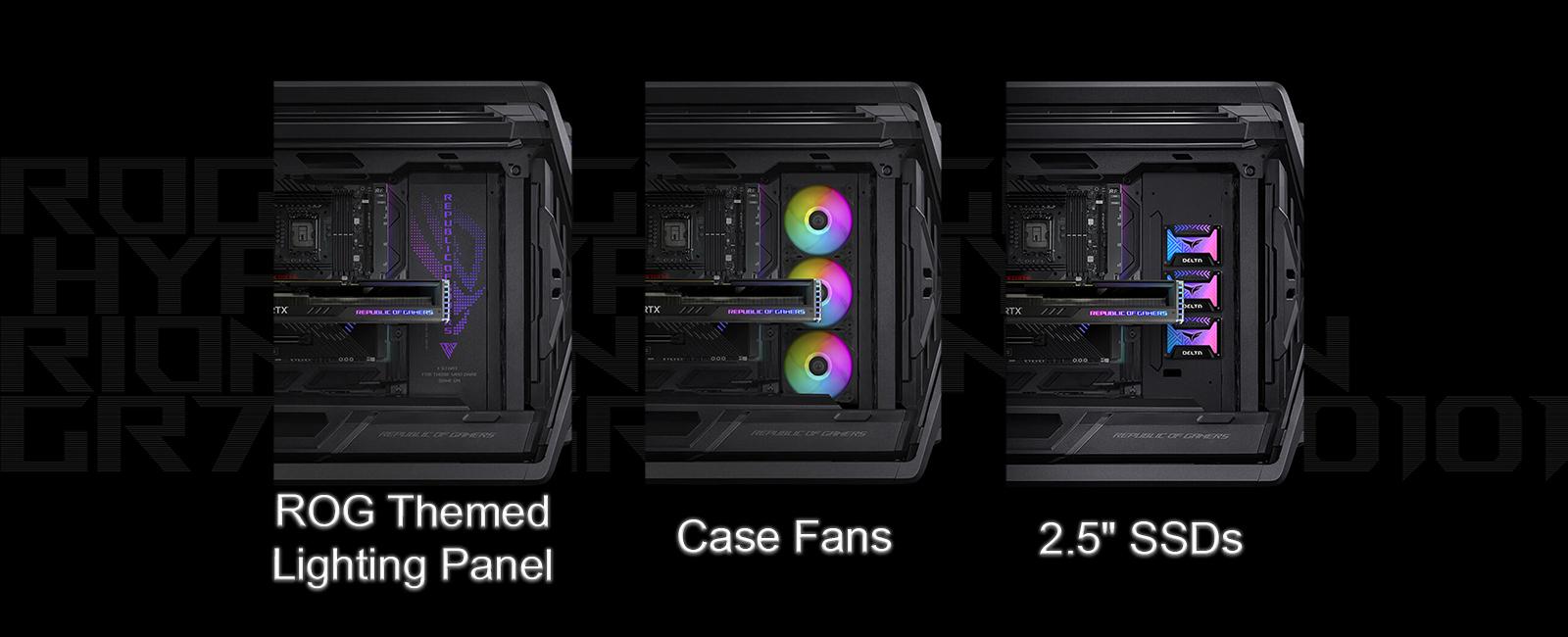 In between the motherboard tray and the front of the chassis sits an innovative vertical installation area that can support a variety of needs. Builders can mount multiple system fans and 2.5-inch SSDs, or a 360 mm radiator, liquid cooling distribution panel, or ROG-themed lighting panel.