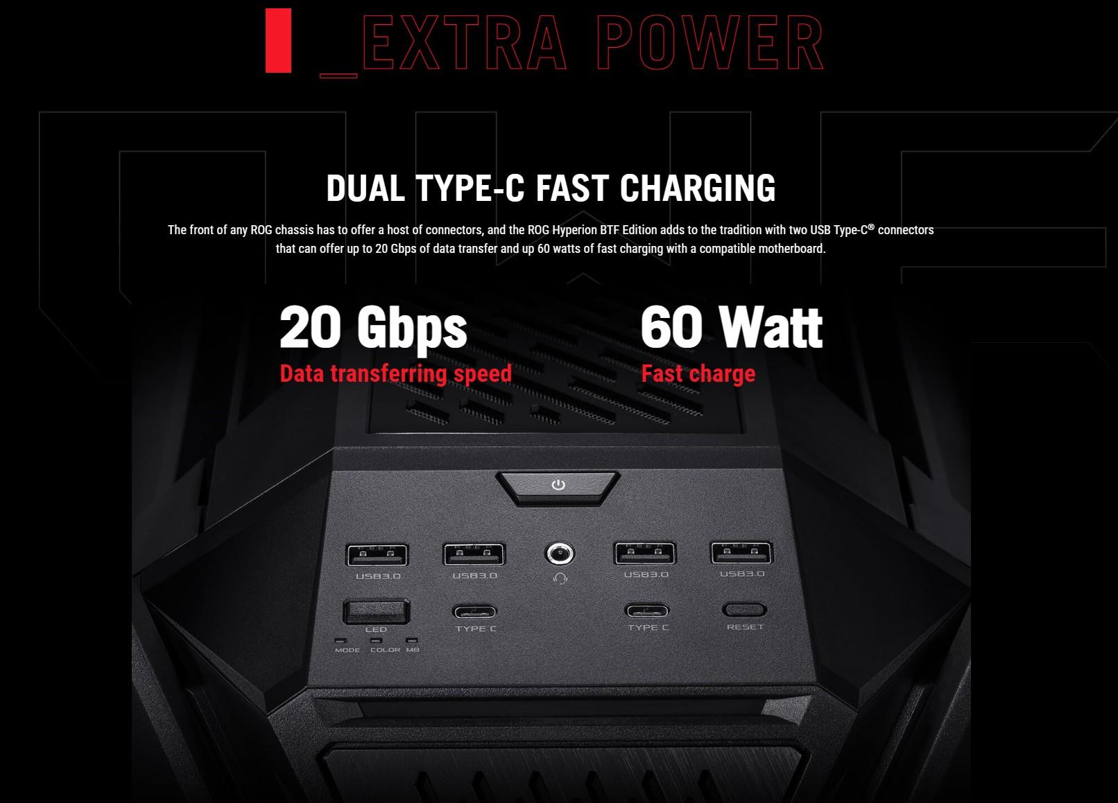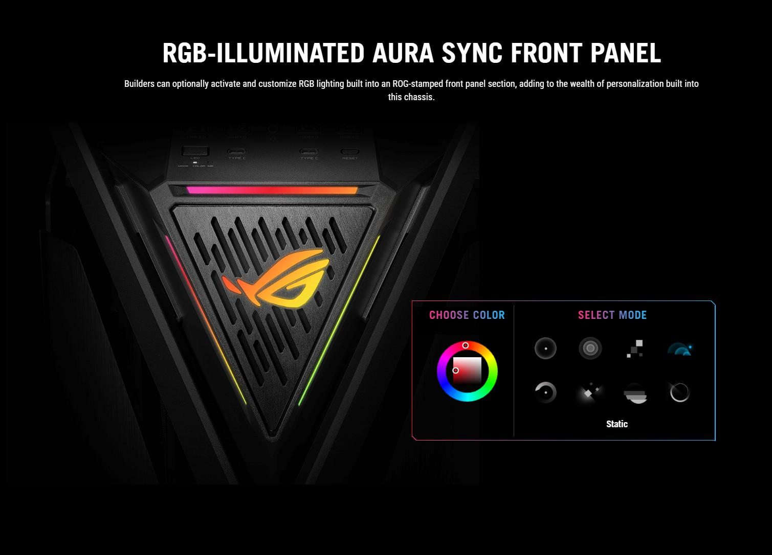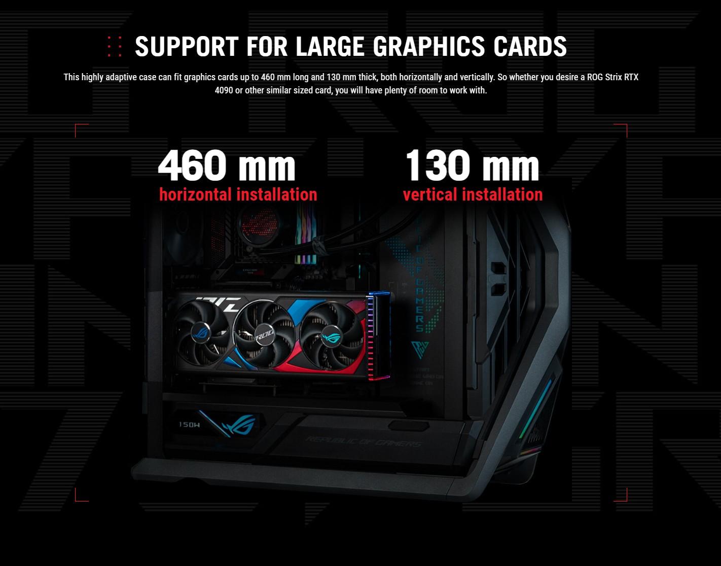 With support for dual 420 mm radiators, towering video cards, a fully integrated 2-way aluminum graphics card holder, 60-watt device charging and dual front USB-C connectors for compatible ROG motherboards, it is truly a PC chassis in the coveted ROG style.