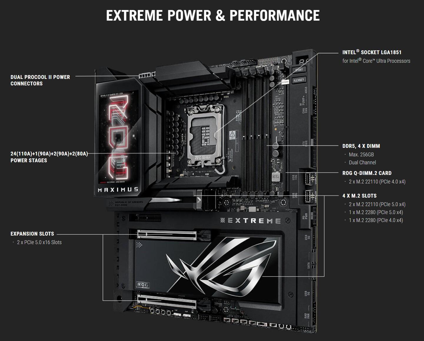 | Software Features | ROG Exclusive Software - ROG CPU-Z - Dolby Atmos - Internet Security (1-year full version) ASUS Exclusive Software Armoury Crate - AIDA64 Extreme (1 year full version) - Aura Creator - Aura Sync - Fan Xpert 4 (with AI Cooling II) - GameFirst - HWiNFO - Power Saving - LCD Display ASUS AI Advisor ASUS Driver Hub Turbo Vcore ASUS GlideX Thunderbolt Share USB Wattage Watcher WinRAR (40 Days Free Trial) Adobe Creative Cloud (Free Trial) UEFI BIOS AI Overclocking Guide NPU Boost ASUS EZ DIY - ASUS CrashFree BIOS 3 - ASUS EZ Flash - ASUS UEFI BIOS EZ Mode - ASUS MyHotkey |