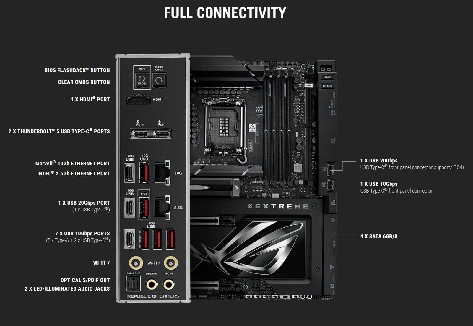 | Back Panel I/O Ports | 2 x Thunderbolt 5 USB Type-C ports 1 x USB 20Gbps port (1 x USB Type-C) 7 x USB 10Gbps ports (5 x Type-A + 2 x USB Type-C) 1 x HDMITM port 1 x Wi-Fi Module 1 x Intel 2.5Gb Ethernet port 1 x Marvell AQtion 10Gb Ethernet port 2 x LED-illuminated audio jacks 1 x Optical S/PDIF out port 1 x BIOS FlashBack button 1 x Clear CMOS button |