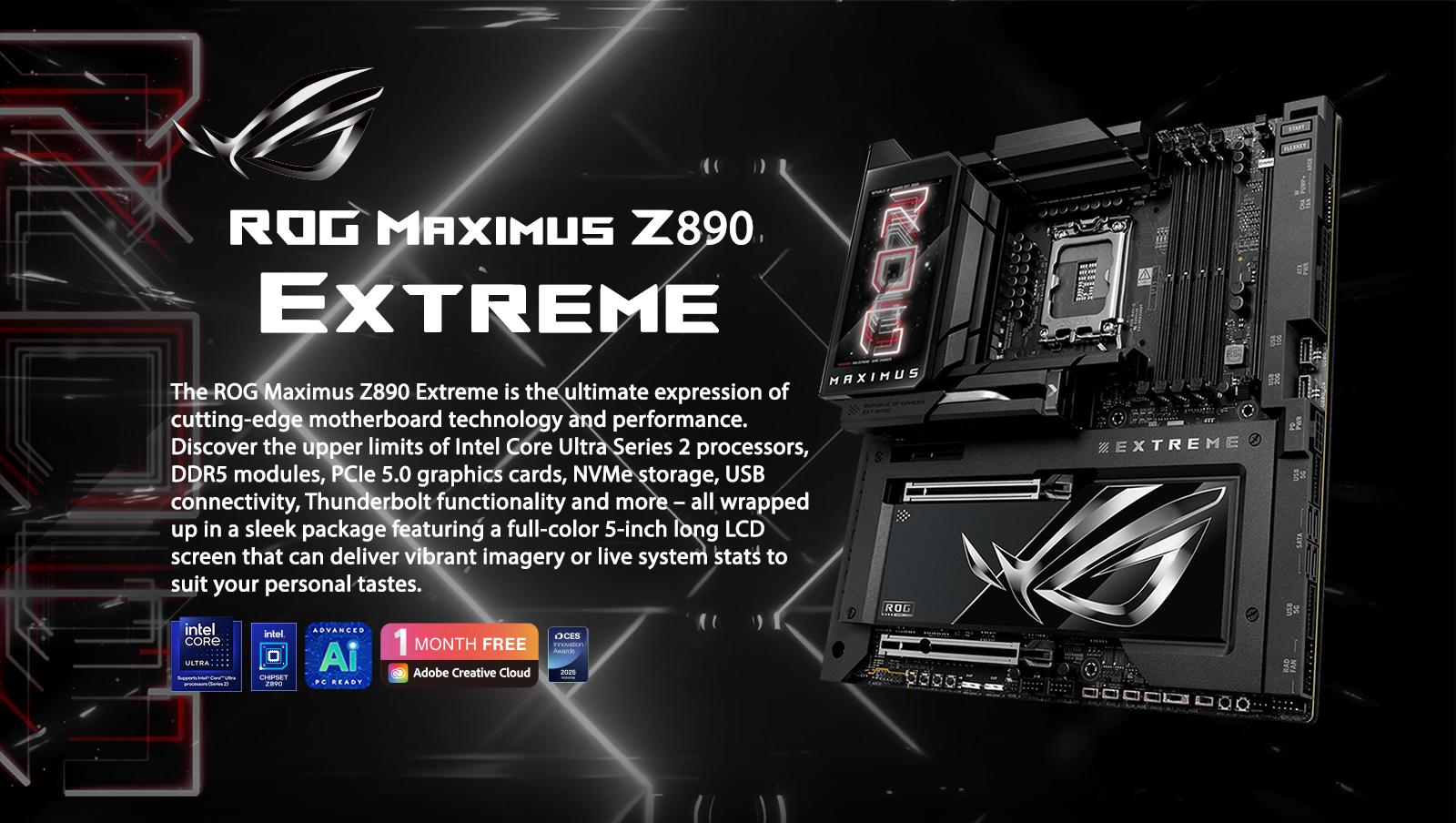 ASUS ROG MAXIMUS Z890 EXTREME este o placa de baza E-ATX ultra premium, creata pentru entuziasti si sisteme AI-ready. Ofera performanta extrema, conectivitate de ultima generatie si tehnologii exclusive ASUS pentru overclocking, racire si personalizare. Este compatibila cu procesoarele Intel Core Ultra (serie 2) pe socket LGA 1851 si include un ecran LCD de 5” pentru monitorizare in timp real.