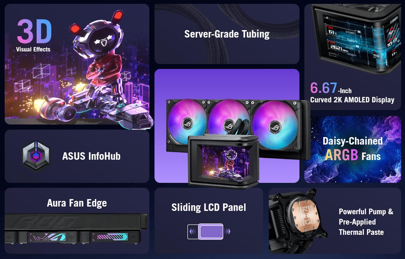ROG Ryuo IV SLC 360 ARGB features a 6.67-inch AMOLED display, enabling intuitive control through dedicated software to smoothly display 3D videos, customized content, or hardware information. The innovative curved-screen design breaks the boundaries between the virtual and the real. The shorter 200mm tubing and a sliding LCD panel also reduce component obstruction, maximizing the visual experience. The powerful pump and ROG ARGB fans provide stable cooling performance for CPUs, including the AMD Ryzen 9000 series and Intel Core Ultra processors.