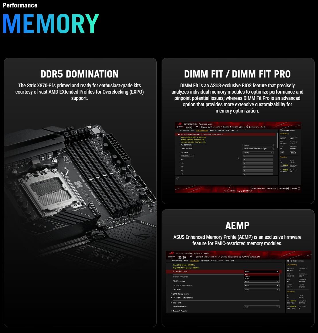 | Memory | 4 x DIMM slots, max. 256GB, DDR5 Supports up to 8000+MT/s(OC) with Ryzen 9000 & 8000 & 7000 Series Processors, ECC and Non-ECC, Un-buffered Memory* Dual channel memory architecture Supports AMD Extended Profiles for Overclocking (EXPO) ASUS Enhanced Memory Profile (AEMP) * Supported memory types, data rate (speed), and number of DRAM modules vary depending on the CPU and memory configuration, for more information please refer to CPU/Memory Support list under the Support tab of product information site or visit https://www.asus.com/support/. * Non-ECC, un-buffered DDR5 memory supports On-Die ECC function. |