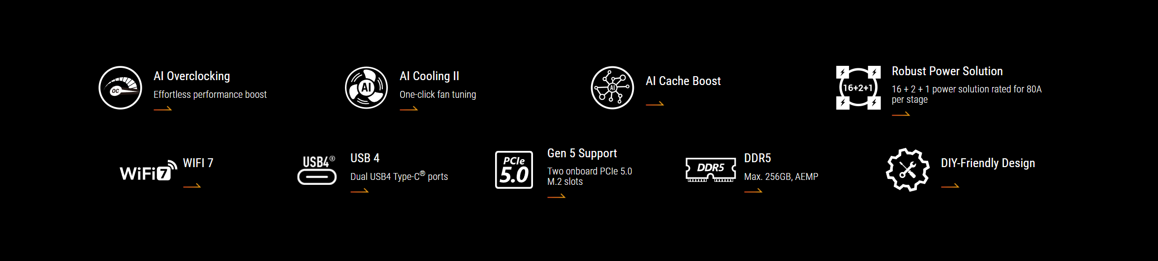 - Tehnologii AI: AI Overclocking, AI Cooling II, AI Cache Boost si AI Networking II pentru performanta optimizata