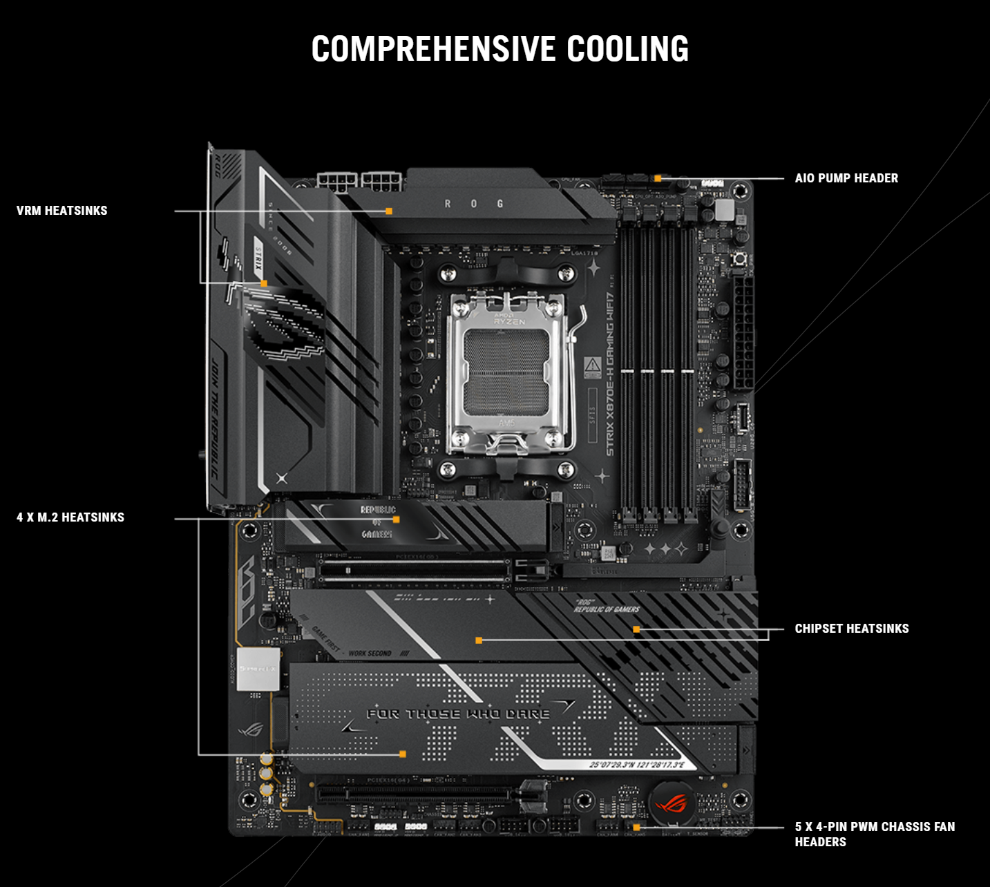 - Stocare ultra-rapida: 4 sloturi M.2 – 2 PCIe 5.0 si 2 PCIe 4.0 pentru SSD-uri NVMe de mare viteza