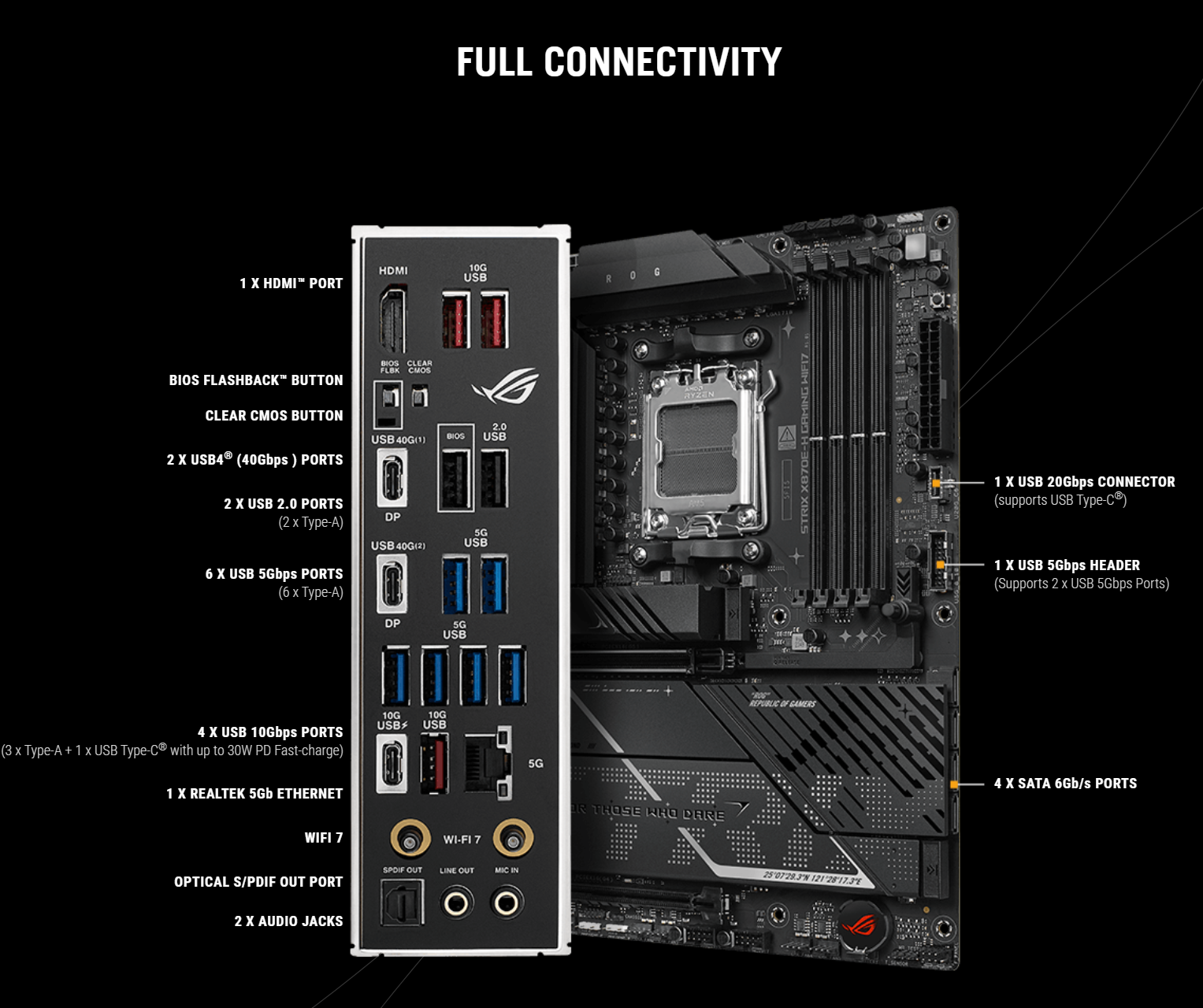 | Back Panel I/O Ports | 2 x USB4 (40Gbps) ports(2 x USB Type-C) 4 x USB 10Gbps ports (3 x Type-A + 1 x USB Type-C with up to 30W PD/PPS Fast-charge)** 6 x USB 5Gbps ports (6 x Type-A) 2 x USB 2.0 ports (2 x Type-A) 1 x HDMI port 1 x Wi-Fi module 1 x Realtek 5Gb Ethernet 2 x Audio jacks 1 x Optical S/PDIF out port 1 x BIOS FlashBack button 1 x Clear CMOS button |