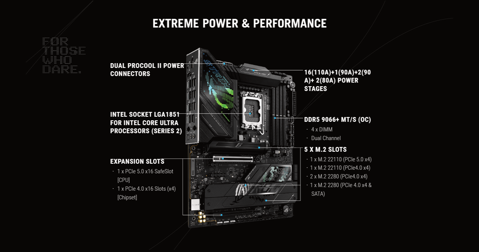 | Expansion Slots | Intel Core Ultra Processors (Series 2) 1 x PCIe 5.0 x16 slot (supports x16 or x8/x4/x4 modes) Intel Z890 Chipset 1 x PCIe 4.0 x16 slot (supports x4 mode) * Please check the PCIe bifurcation table on the support site (https://www.asus.com/support/FAQ/1037507/). - To ensure compatibility of the device installed, please refer to https://www.asus.com/support/ for the list of supported peripherals. |