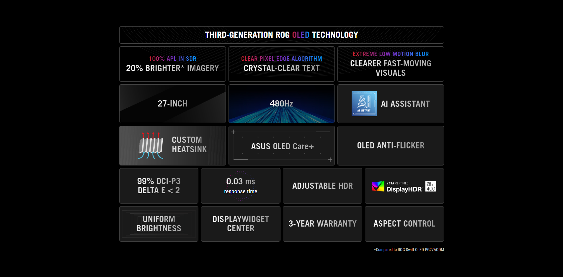 the new ROG AI Assistant is designed to improve gaming experiences. To ensure the longevity of the monitor, new OLED Care+ software offers a