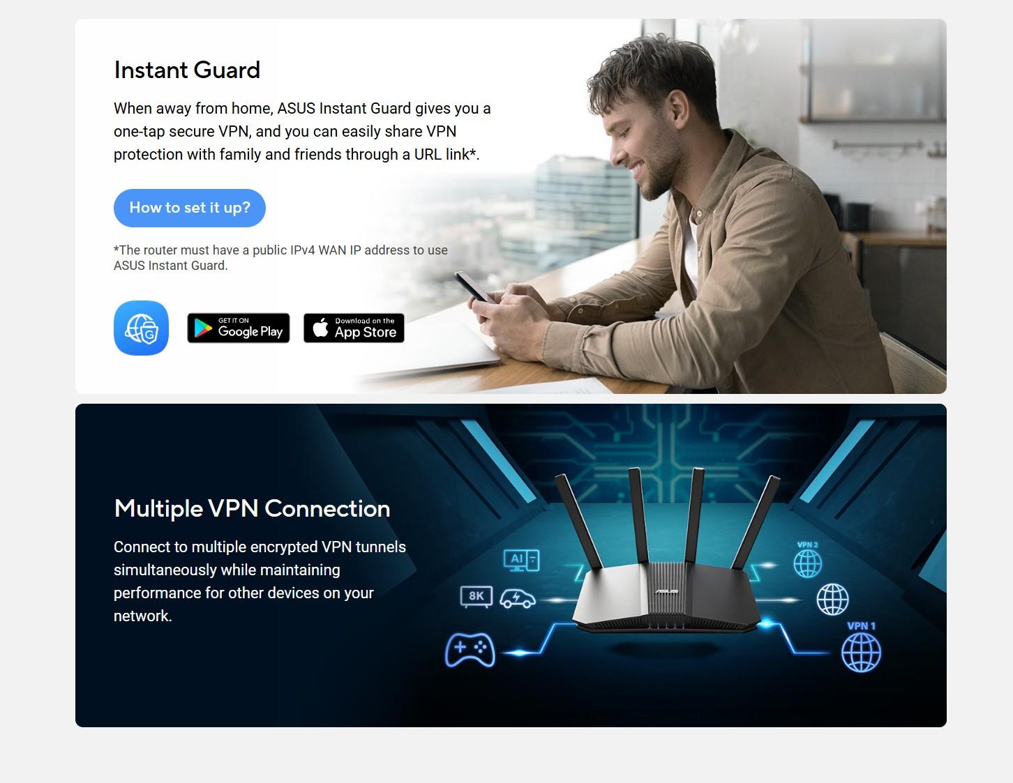 | VPN | Instant Guard VPN Client L2TP VPN Client Open VPN VPN Client PPTP VPN Client WireGuard VPN Server IPSec VPN Server Open VPN VPN Server PPTP VPN Server WireGuard |