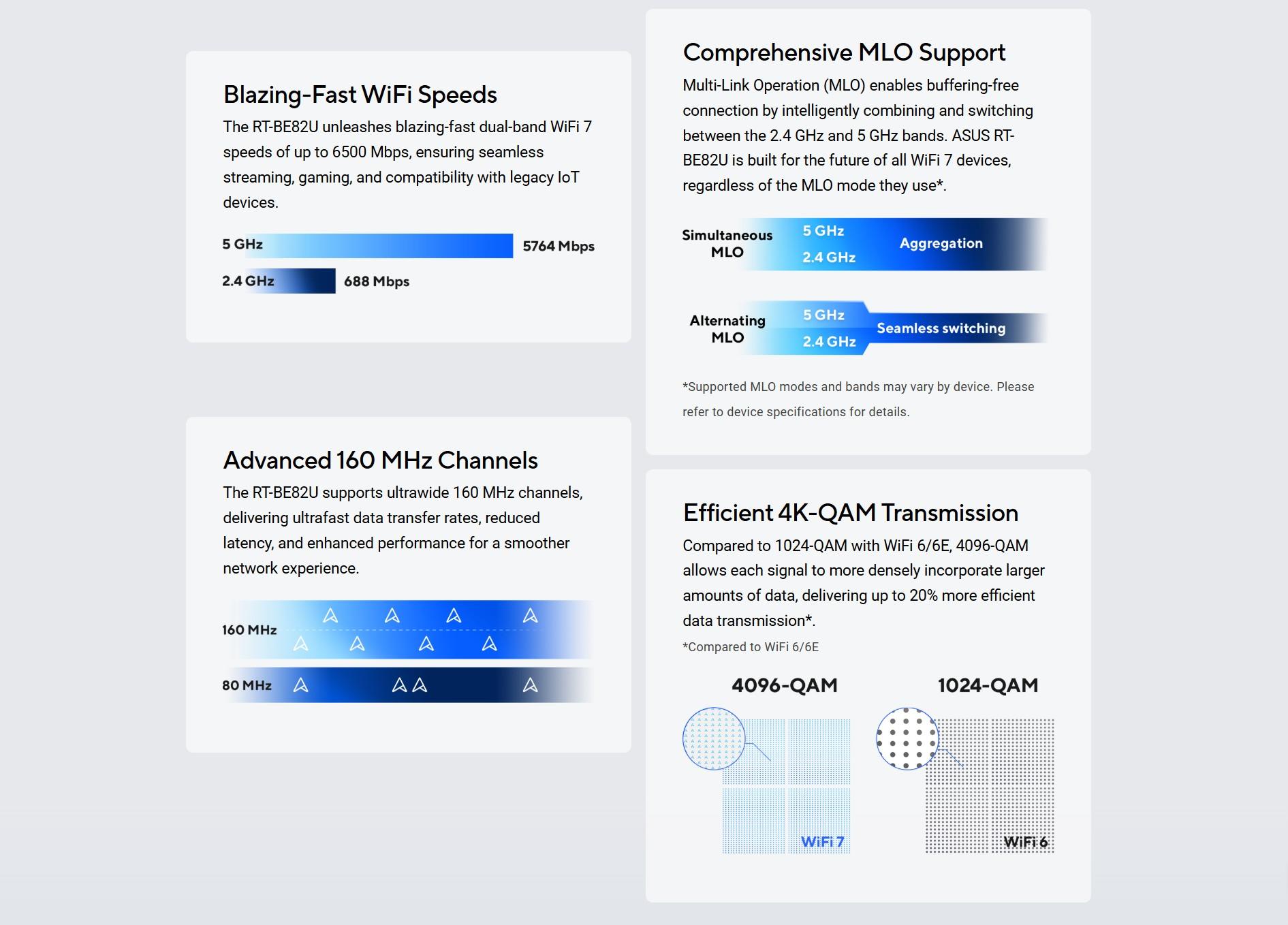 | Boosts Speed | OFDMA (Orthogonal Frequency Division Multiple Access) Beamforming: standard-based and universal 4096-QAM high data rate 20/40/80/160 MHz bandwidth |
