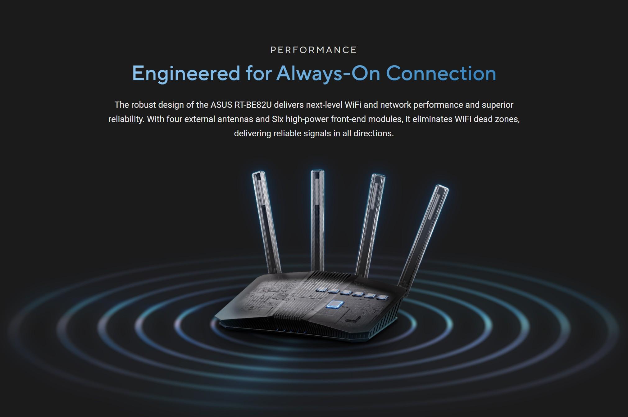 ASUS RT-BE82U este un router WiFi 7 dual-band BE6500, ideal pentru locuinte inteligente si utilizatori avansati care vor viteze mari, acoperire extinsa si protectie completa într-un format accesibil.