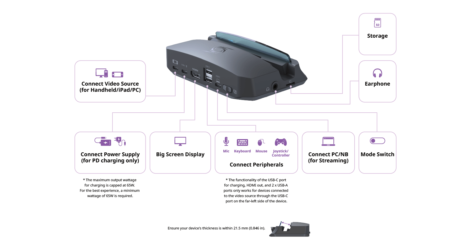 *Caution: Please use the supplied cables, especially the Type-C to Type-C cable for the source (e.g. handheld console) port. For optimal performance and safety, please use the official handheld console's power adapter when charging.