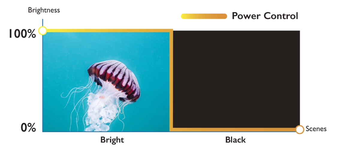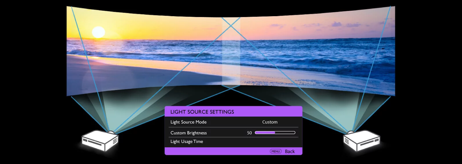 Custom Light Mode modulates light power output from 40% to 100% under a scale of 80 steps, optimizing the projected image in a variety of ambient