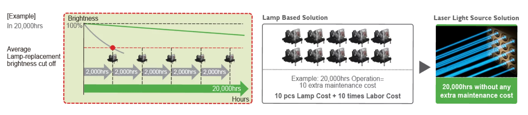 BenQ projectors feature laser light source guaranteed for 20,000 hours of maintenance-free operation, saving costs for lamp replacement and