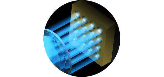 Zero-deviation alignment of laser diodes boosts luminous flux into the light tunnel, improving light efficacy to 5,000 lumens.
