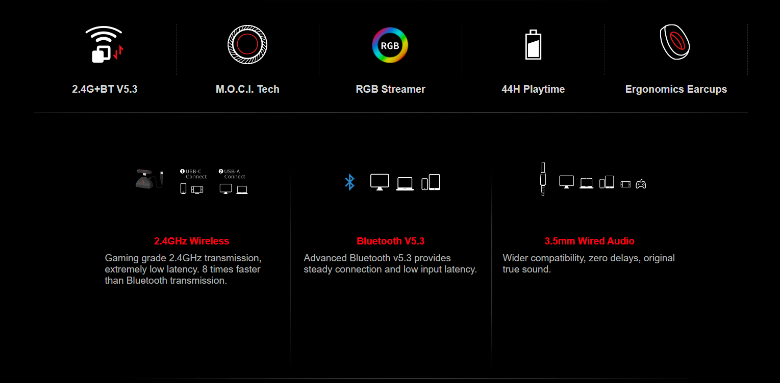 | Connection Mode | ① 2.4GHz Wireless ② Bluetooth v5.3 ③ 3.5mm Wired Audio |