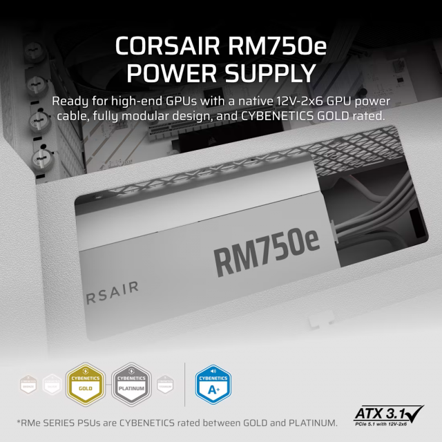 Corsair RM750e este o sursa de alimentare fiabila si eficienta, ideala pentru sisteme moderne de gaming sau productivitate. Ofera certificare 80 PLUS Gold, design semi-modular si functionare silentioasa, fiind o alegere excelenta pentru configuratii echilibrate si stabile.