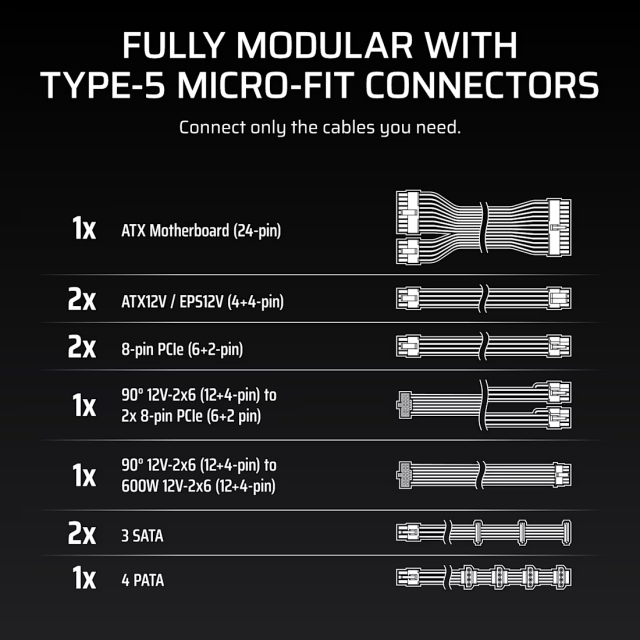 - Design complet modular – Doar cablurile necesare sunt folosite, imbunatatind fluxul de aer si estetica sistemului.