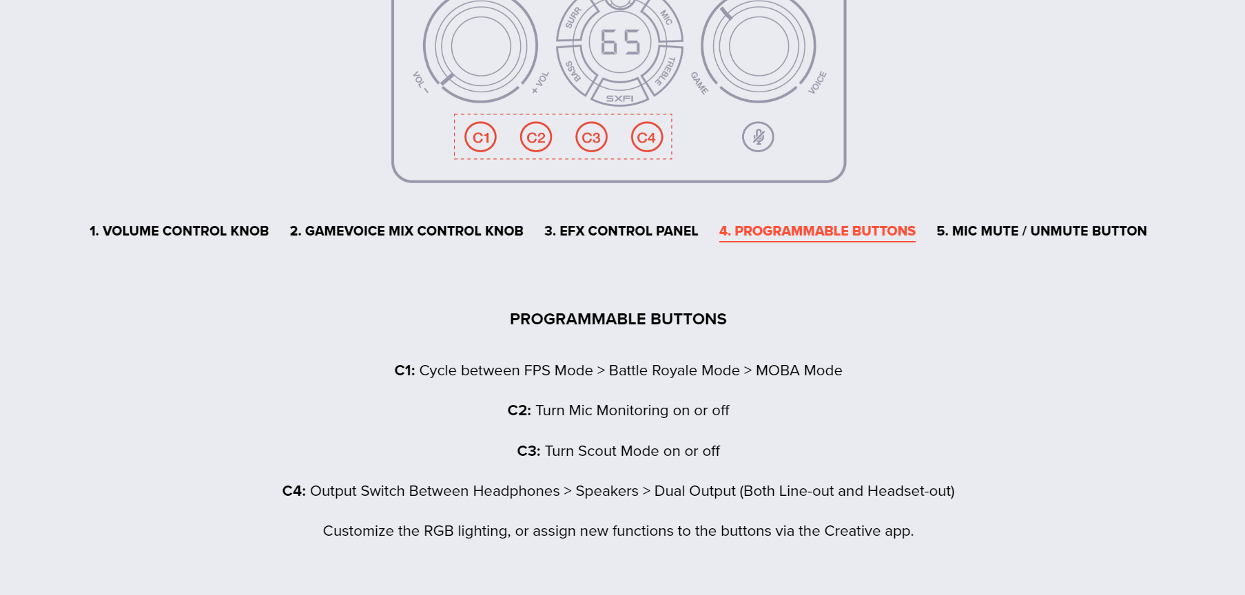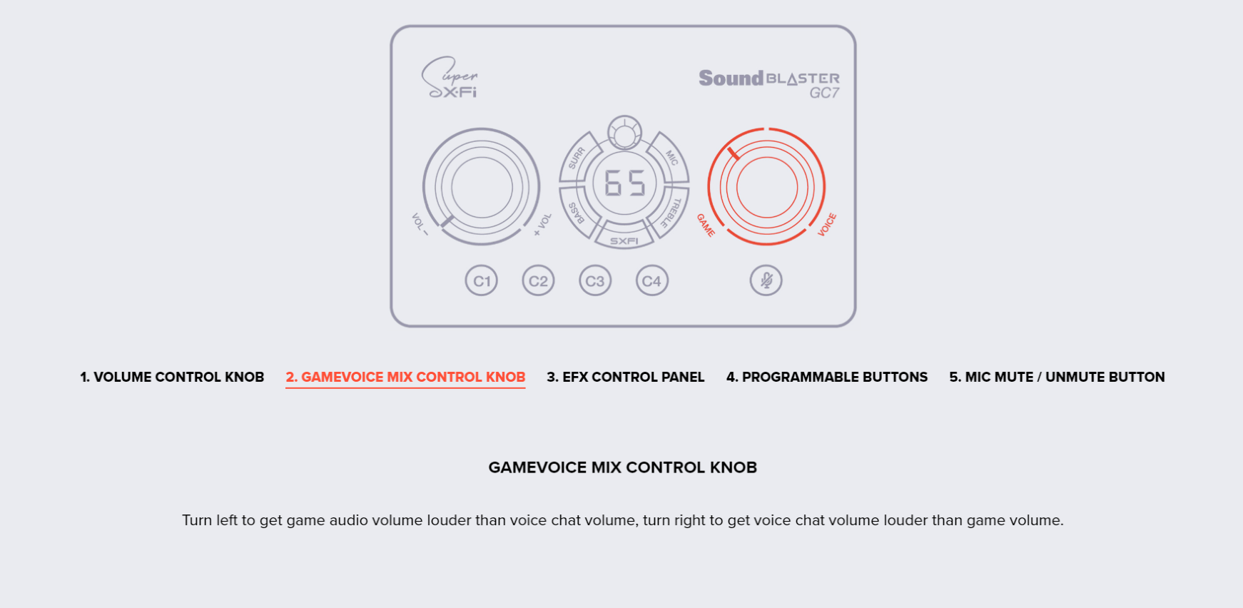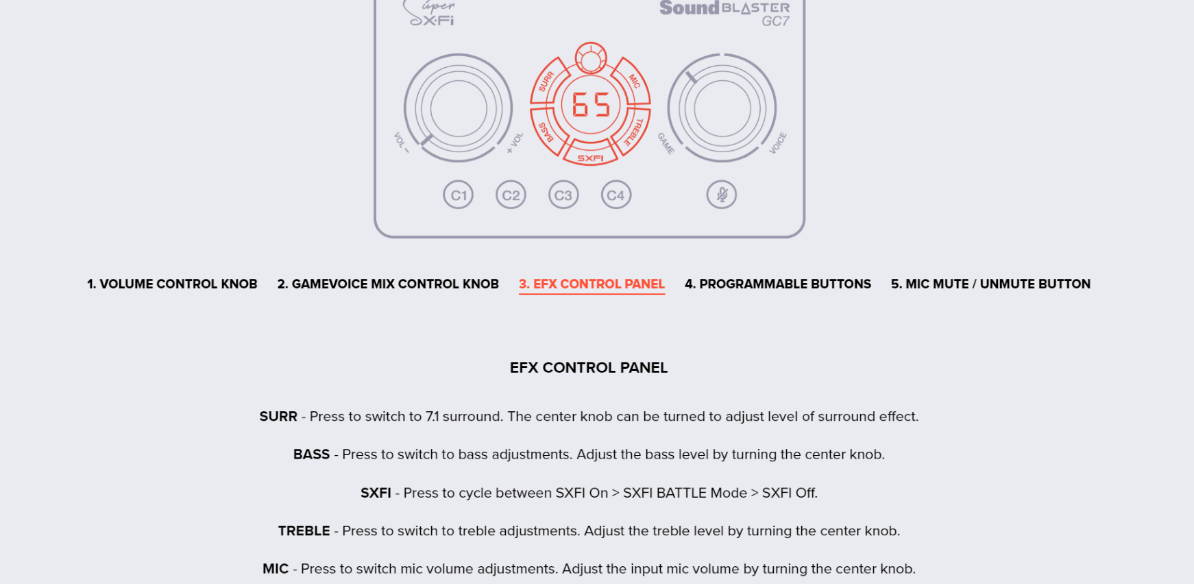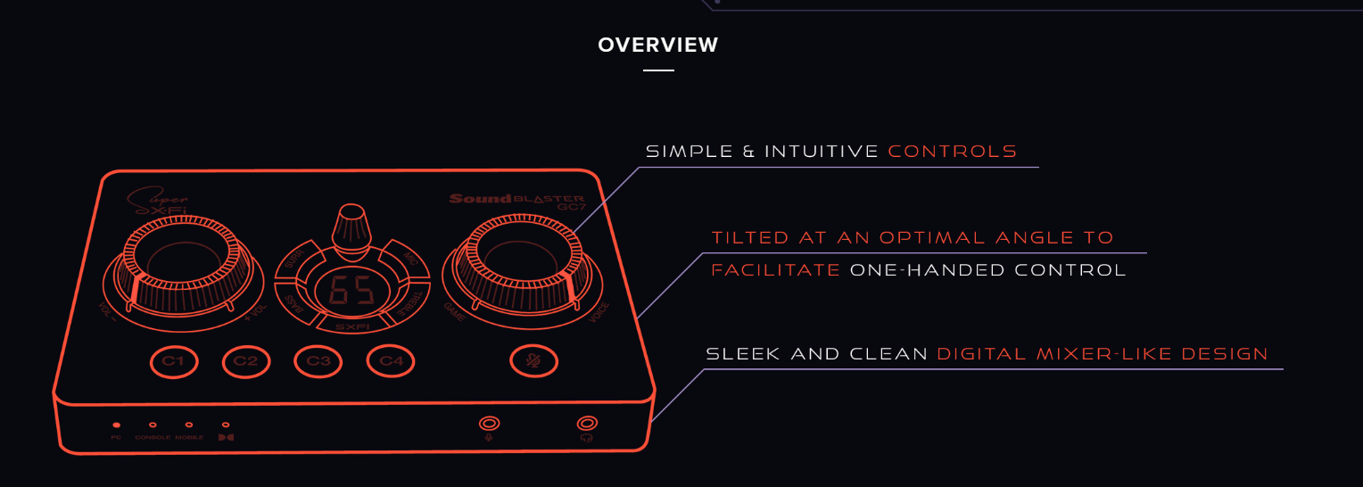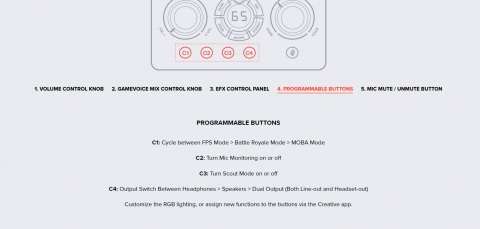 Master volume dial, GameVoice Mix dial, SXFI button, Surround button, Bass button, Treble button, Mic button, Rotary dial, Mic mute / unmute button, Power button, Platform mode switch, Headphone gain switch, 4 Reassignable C1-C4 buttons |