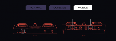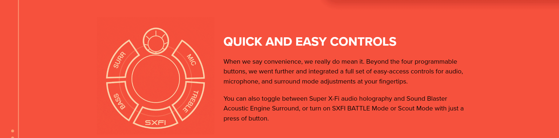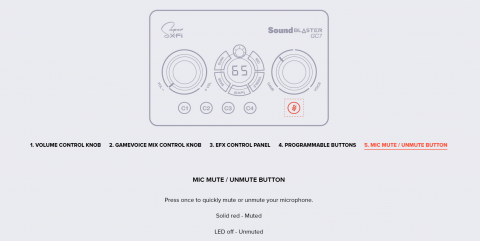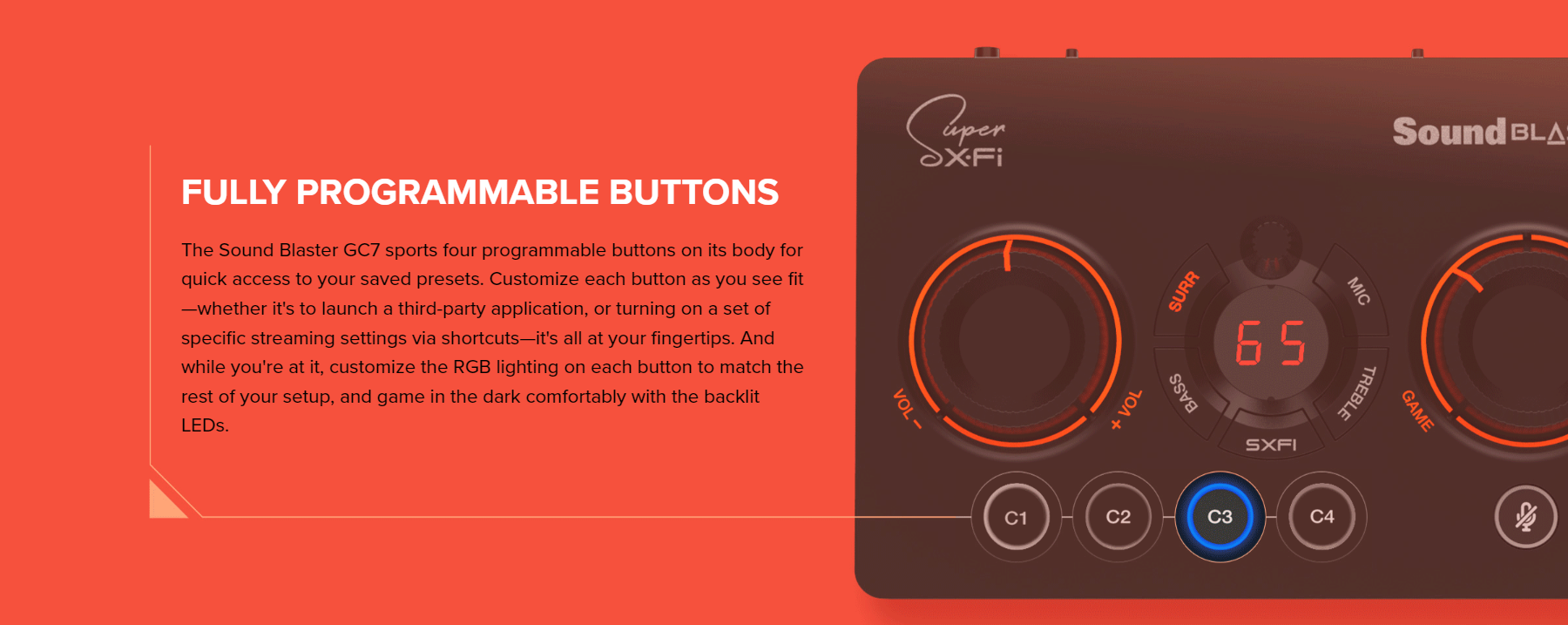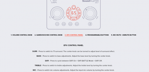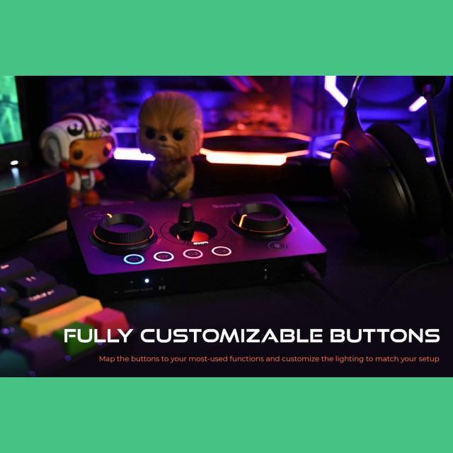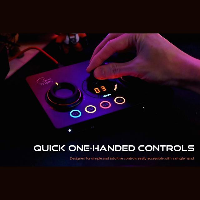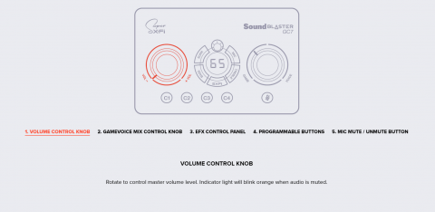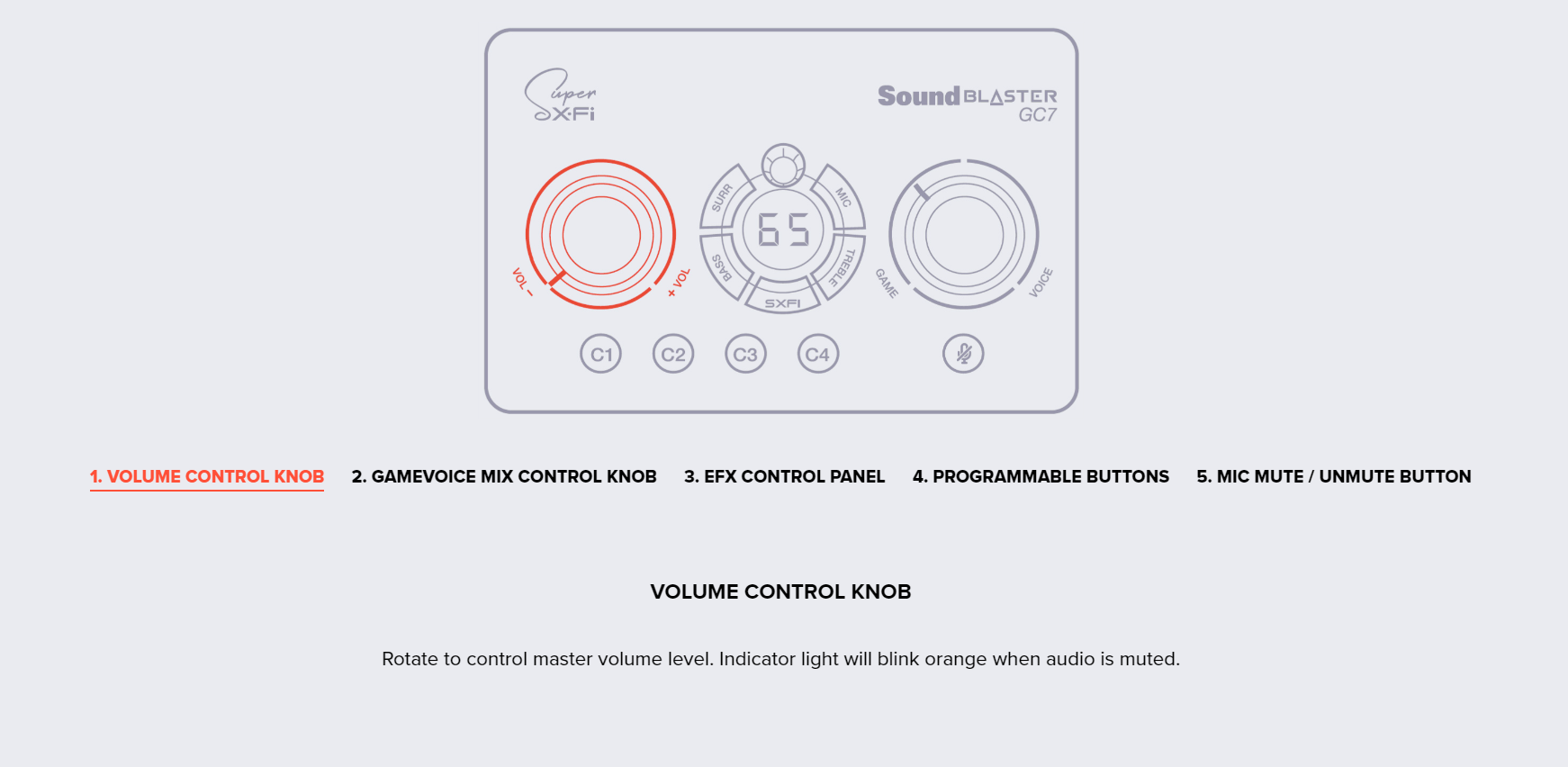 Master volume dial, GameVoice Mix dial, SXFI button, Surround button, Bass button, Treble button, Mic button, Rotary dial, Mic mute / unmute button, Power button, Platform mode switch, Headphone gain switch, 4 Reassignable C1-C4 buttons |