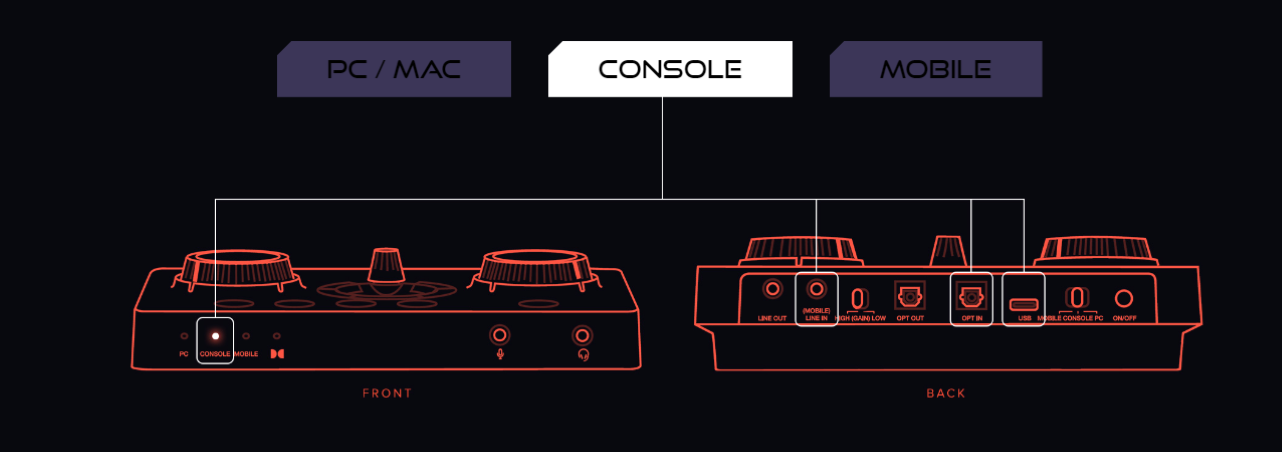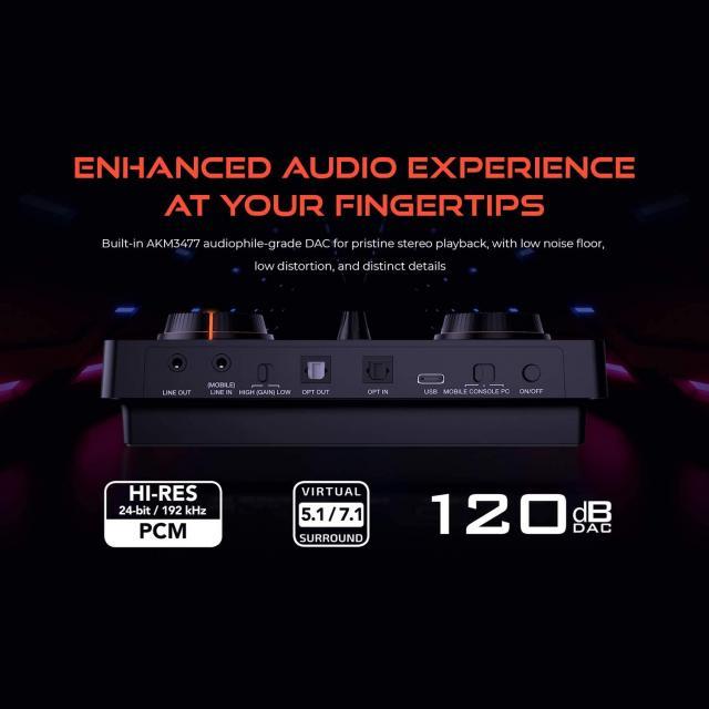 1 x 1/8″ Ext. Mic-in Jack, 1 x 1/8″ Line In / Mobile, 1 x 1/8″ Line Out, 1 x 1/8″ 4-Pole Combo Jack, 1 x SPDIF In, 1 x SPDIF Out, 1 x Type-C port for PC / Mac / Consoles |