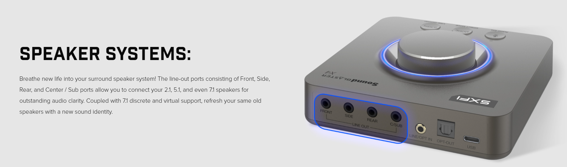 1 x TOSLINK Optical Out, 1 x ⅛″ Rear Out, 1 x ⅛″ Center / Sub Out, 1 x 1/8″ Headphone / Headset Jack, 1 x 1/8″ Ext. Mic-in Jack, 1 x ⅛″ Front-out, 1 x ⅛″ Side Out Jack, 1 x USB-C port for PC / Mac, 1 x ⅛″ Optical / Line-in Combo Jack |