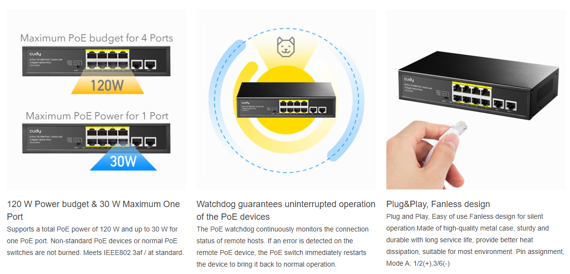 120W PoE putere de iesire total, pana la 32W pentru un port PoE