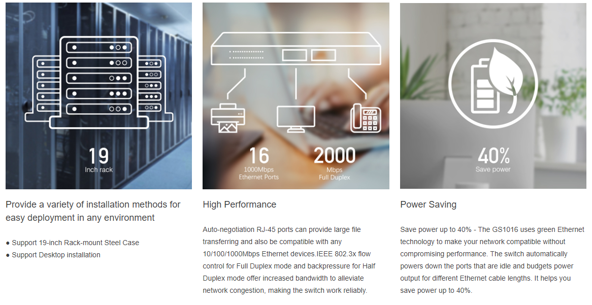 ● Switch GS1016 - 16x 10/100/1000 Mbps RJ45 porturi de negociere automata, care suporta Auto-MDI/MDIX