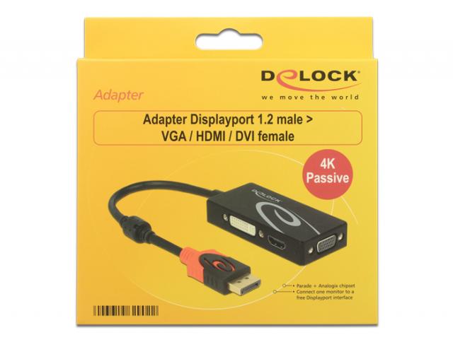 Cu acest adaptor DisplayPort de la Delock, sistemul poate fi extins printr-o interfata VGA, HDMI sau DVI si se pot conecta diverse dispozitive, precum un televizor, un proiector, un monitor etc. Numai un singur monitor poate fi folosit impreuna cu adaptorul.