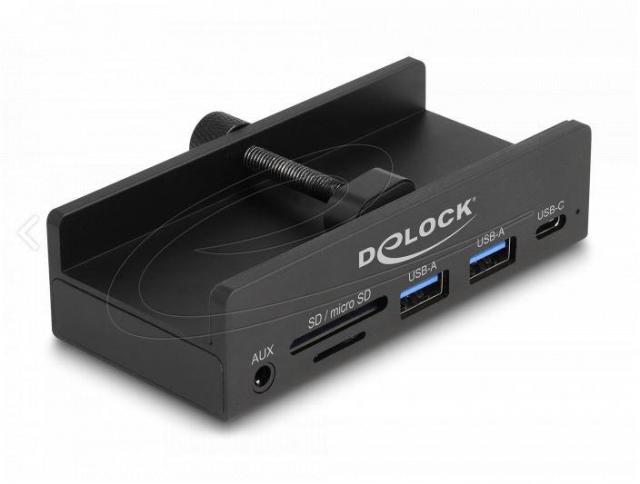 Hub USB Delock, 3 porturi, 5 Gbps, 2 x USB-A, 1 x USB-C, Cu mecanism pentru montare pe monitor/birou, Cititor de card-uri integrat cu 2 slot-uri