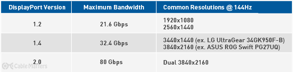 Aceste cifre sunt identice cu cele ale DisplayPort 1.3, deoarece DisplayPort 1.4 a fost mai mult o actualizare a caracteristicilor decât o schimbare fizică a cablului sau a designului. Cu toate acestea, a integrat Display Stream Compression (DSC) 1.2, un format de compresie fără pierderi care deschide o gamă mai largă de rezoluții și rate de reîmprospătare decât ar putea permite altfel lățimea de bandă.