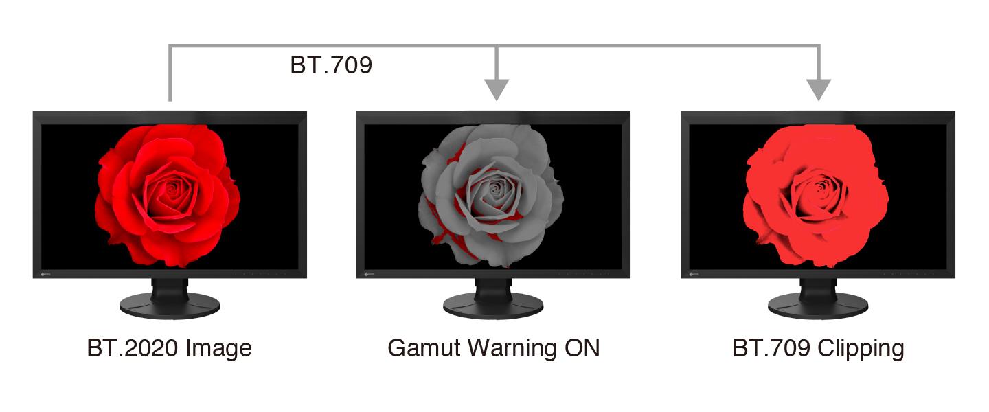 The monitor includes a Gamut Warning preset that when selected, indicates areas of a BT.2020 image that cannot be reproduced using BT.709 by converting them to shades of gray. An additional mode called BT.709 Clipping allows the editor to view BT.2020 images within the BT.709 color space, simulating how it would look to their audience in an HDTV environment.