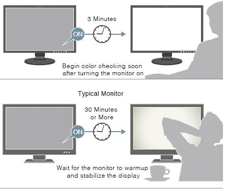 A typical monitor takes 30 minutes or more for its brightness, chromaticity, and tone characteristics to stabilize. The ColorEdge CG2700X takes a mere 3 minutes. Whether you are working in a studio or taking the monitor with you on location, you get reliable color display soon after turning the monitor on.