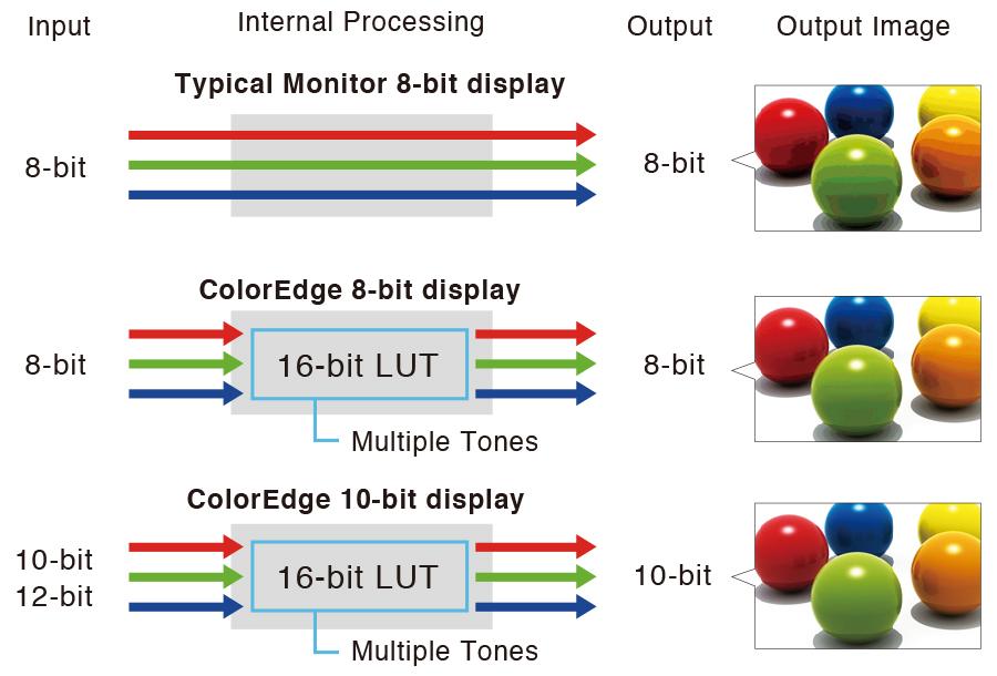 Using the DisplayPort or HDMI input, the ColorEdge monitor offers 10-bit simultaneous display* from a 16-bit look-up-table (LUT) which means it can show more than one billion colors simultaneously. This is 64 times more colors than you get with 8-bit display, resulting in smooth color gradations and reduced Delta-E between two adjacent colors.
